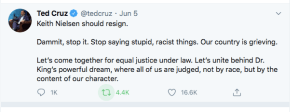 This was in response to Keith Nielsen. In the state where George Floyd will be buried this week a series of racist and conspiracy theory posts were circulated by five Texas GOP leaders. Cynthia Brehm and two others promoted a Facebook post suggesting George Floyd’s death was staged. Keith Nielsen shared a Martin Luther King Jr. quote over a picture of a banana.¹ Number five urged followers to consider that liberal billionaire George Soros pays black people to riot to keep “race wars” flaring. In an already traumatizing week, the salvos against racial equity were only eclipsed by the sickening #GeorgeFloydChallenge where kneeling on someone’s necks is posted as a joke.