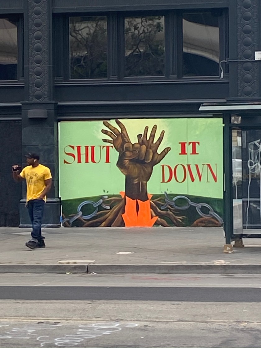 On Broadway – artwork on the boarded up windows in Broadway in Oakland CA