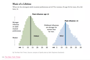 Growing up, with so much music available, I wondered why my parents, and actually all older adults seemed to be stuck in some bygone musical era. As youth do, I proclaimed, that’s not going to happen to me, I will always know new music.1 And you, what are your top songs? Think of the songs makes you happy, the ones that make you want to dance or make you sing along, the ones that make you cry. Come on, write them down for this exercise. Pause. Now, look at your list; are most of your songs from a particular decade? Most of us have a soundtrack for our lives heavily influence by what we liked in our youth.
