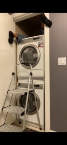 A few years back, my car stopped in the middle of a tunnel. The guy behind me came up to my window said “I can do this, I can get you out of here. I’ve done this. We can do a bumper push.“ There was no cell service in the tunnel and I thought, nothing to lose. It worked, I was grateful. A couple of months ago, my neighbor mentioned an alarm going off behind the stacked washer dryer in the laundry closet. Aha, “I know what it is, I can fix it.” Conventional wisdom would be to remove the dryer from the top of the stack and then pull out the washer to get in order to reach what ever has fallen behind the stack. There is no “wiggle room” with only 2 inches of clearance horizontally on each side and 16 inches of clearance from the top. But, I had perfected the up and over technique and In less than 2 minutes I was up and over with the retrieved the alarm.