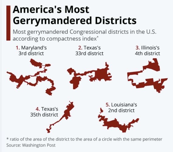 1. Gerrymandering- Gerrymandering manipulate the boundaries of an electoral constituency to favor one party or class. This allows a political party, its candidates and operatives were not in fear of losing power. The Supreme Court in June of 2022, reinstated a racially gerrymandered map in Louisiana.
