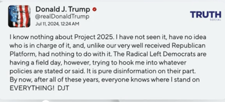 It’s the same play, deny familiarity – “I don’t know who or what <insert name> is.” Give an alibi – ” I never met, had contact or seen <topic.>” Later, when proof appears such a photos, comments, etc, respond with “I met lots of people, take lots of pictures, they like me.” There is a fundamental difference between denounce versus downplay and distance. Trump has denounced nothing and the GOP has denounced nothing around Project 2025.