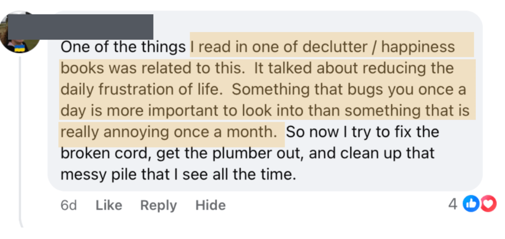 “Something that bugs you more than once a day…” That stood out from a comment last week. My amorphous to do list and inaction paralysis bugs me several times a day. I emphasize this because the follow up will take work, but, it has priority because it bugs me. Do you have anything like that; something that bugs you more than once a day?
