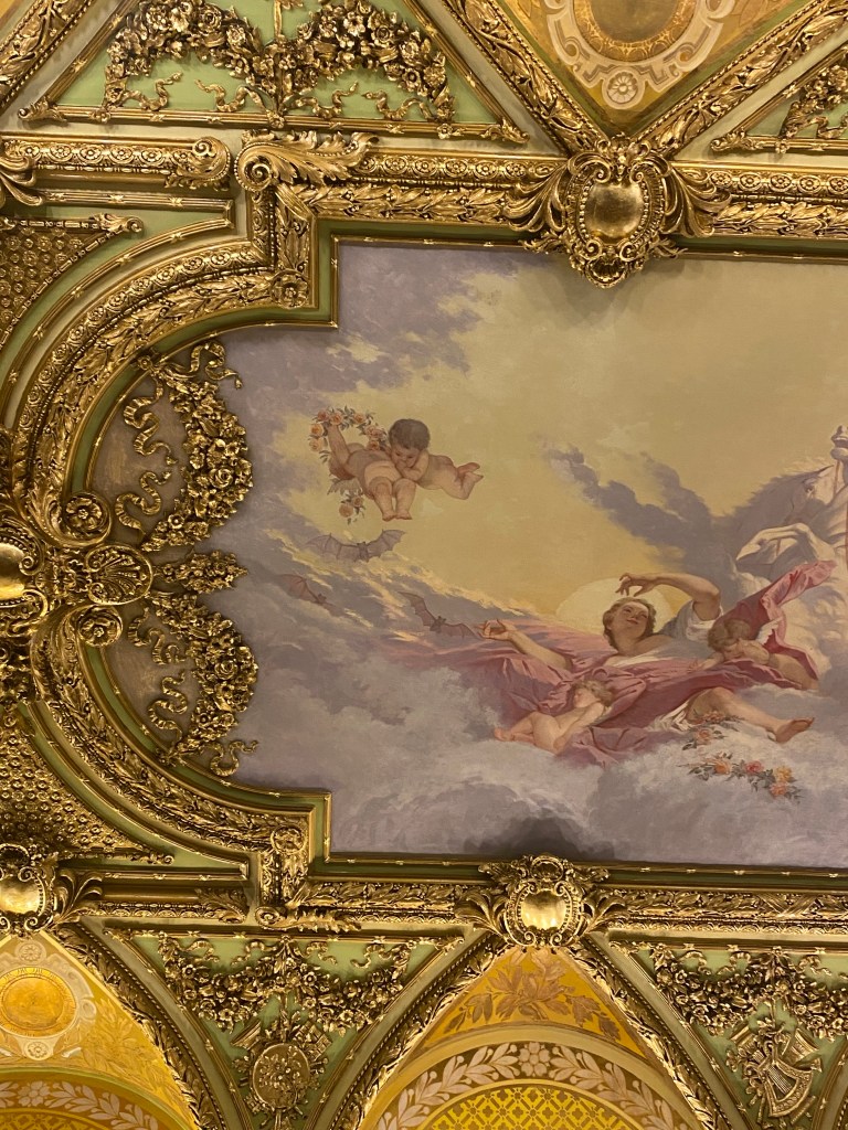 Architectural & History Theater Tour: The tour guide highlighted three bats painted in the ceiling mural along with the cherubs. Look at the two cherubs on the upper left, by the feet to locate the bats.