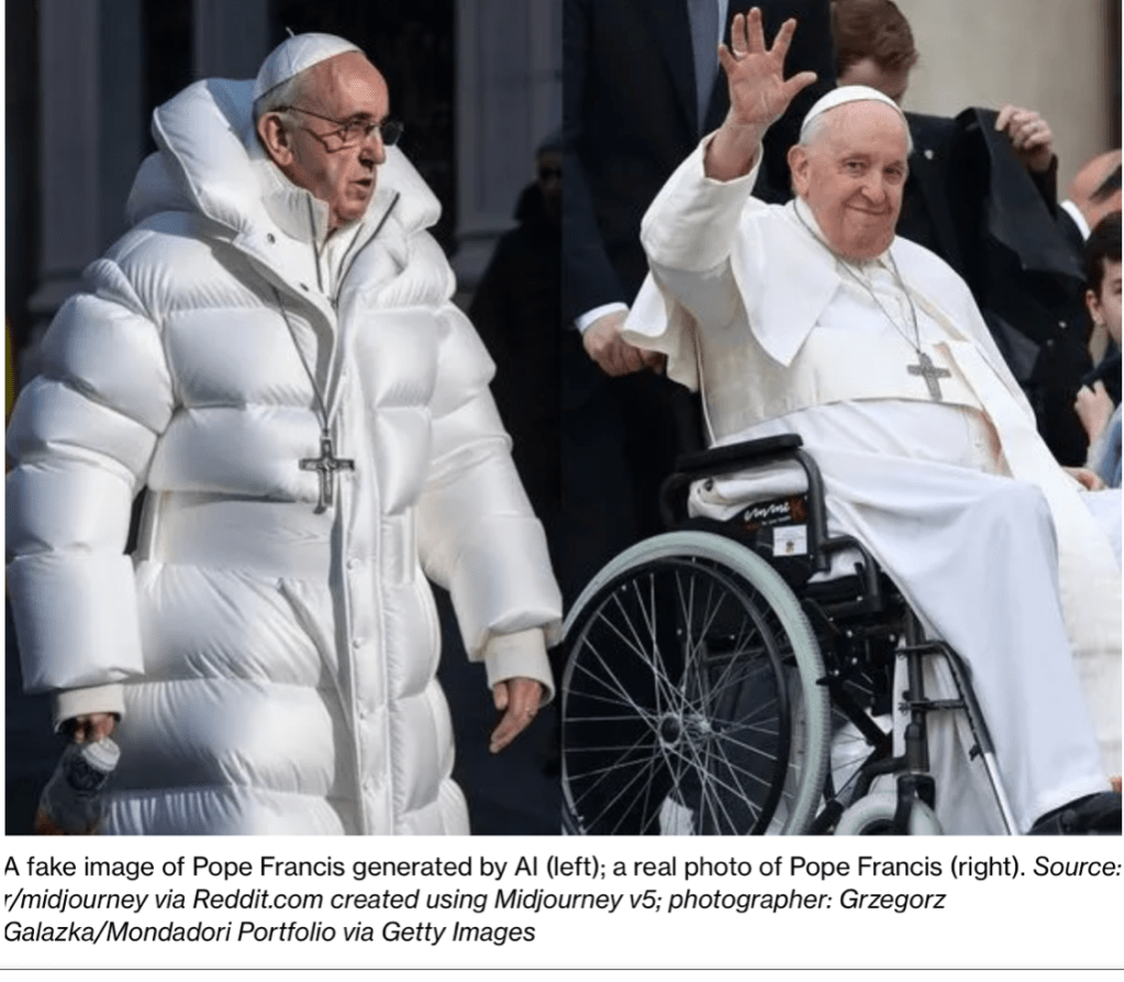 These manipulate images or deepfakes typically serve to either reassure, provoke outrage and alarm. The image of the princess was to reassure came out on March 10, 2024. Catherine had other been seen publicly since her “planned abdominal surgery in January of 2024. There is also a third category, humor. There is the infamous “photo” of Pope Francis in a Balenciaga puffer coat. OK, for a few who believed this to be true, it did spark outrage.