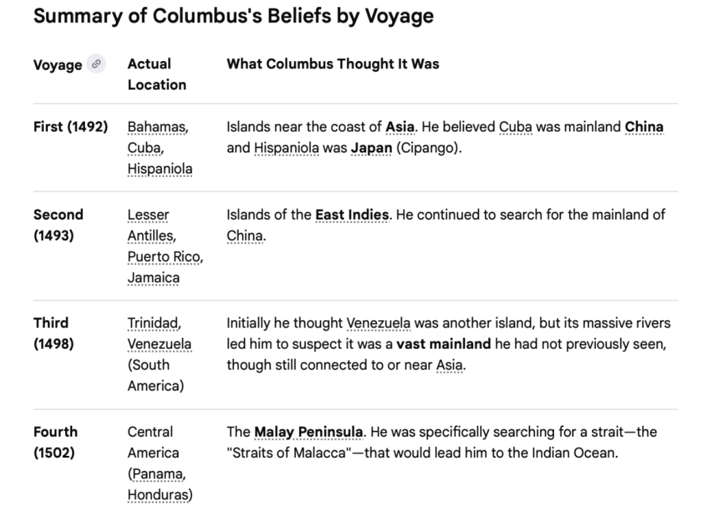 Dude had 17 ships for his second voyage and not a single member of the crew had ever been to Asia? No one said, we’re not in Asia? Don’t Sailers navigate by moon and star position, had he “discovered” a new galaxy also? Oh, I get it. Columbus “discovered” a way to make money.