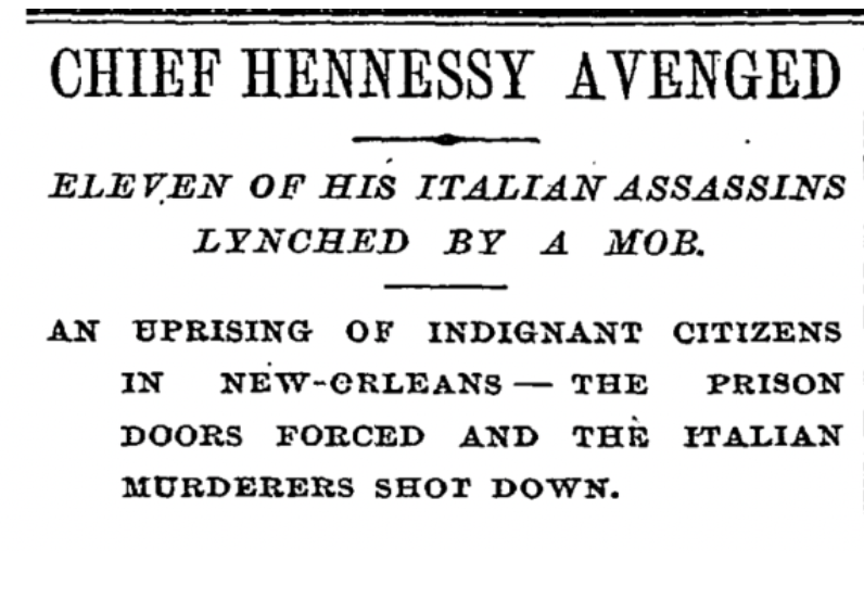 New Orleans, 1891, eleven Italian Americans were lynched. Eleven on one day! The police chief of New Orleans was murdered and people believed organized crime was responsible. Mayor Joseph Shakspeare told the police to “Scour the whole neighborhood. Arrest every Italian you come across.” Nineteen Italian-Americans were accused of the murder. After the acquittal of six and mistrial of three, the town grew impatient and angry. A Lynch mob, know as The Committee, burst into the jail and killed 11 of the 19. ” The Italian Government demanded criminal charges for the Lynch Mob and reparations for the victims.