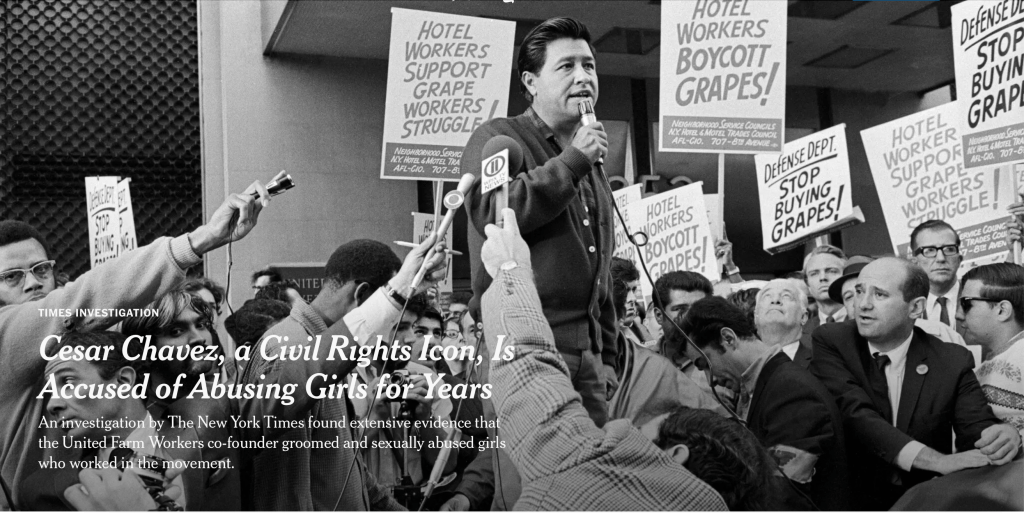There is a difference between a reaction and a solution. For César Chávez, two things are true, he did have a major influence in the US for good and a significant impact on women for bad. Now what is the solution? Yet at other times, why do we normalize predatory behavior to create a fictionalized version of what a hero is?